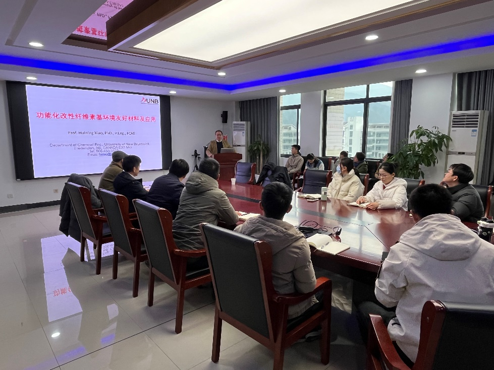 作题为“功能化改性纤维素基环境友好材料及应用”的学术报告,报告由学院副院长胡志军教授主持,教务处处长沙力争教授、轻化工程系教师以及研究生和本科生等50余人参加了报告会。