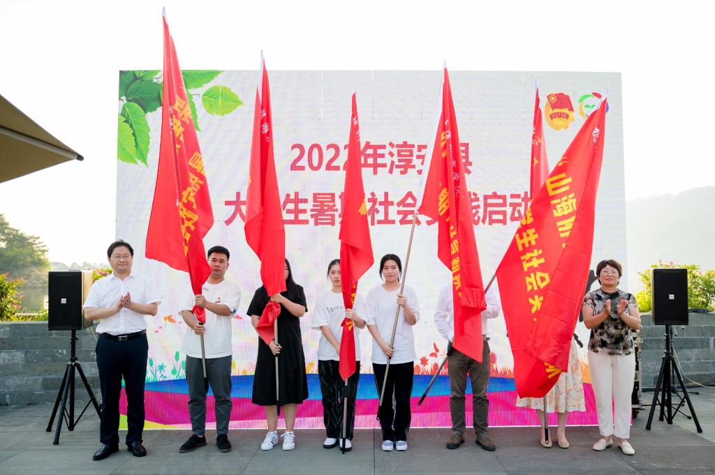 最后,许海波、汪雪梅为大学生暑期社会实践团队代表授旗,2022年淳安县大学生暑期社会实践正式启动。