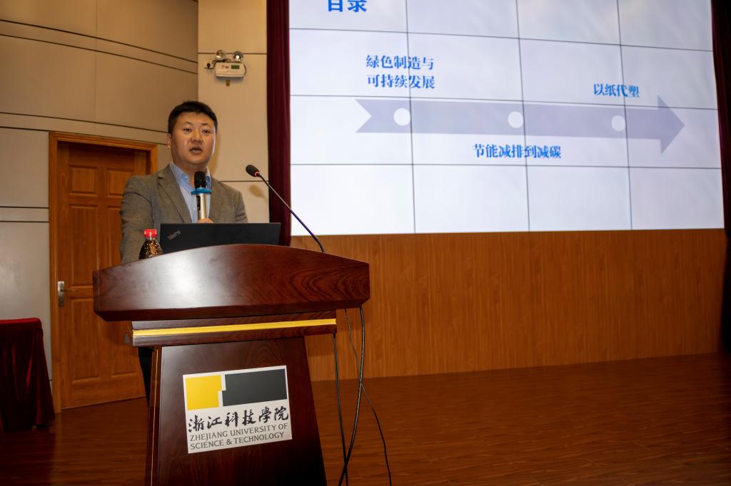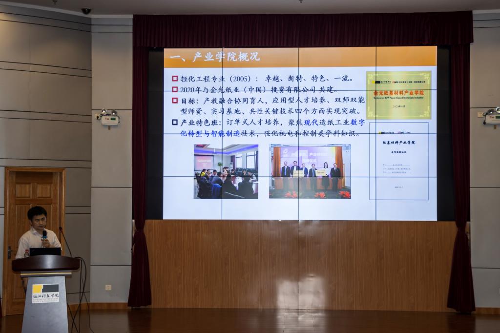 产教融合创新发展论坛上,胡开堂理事长做主题为“纸基材料行业现状与分析”报告,介绍了全国以及浙江纸基材料企业发展现状。忻皓秘书长阐述了我国碳减排和以纸代塑的背景与政策。胡志军副院长介绍了产业学院背景、建设进展与建设规划。张学金副院长汇报了纸基材料团队的最新创新成果。