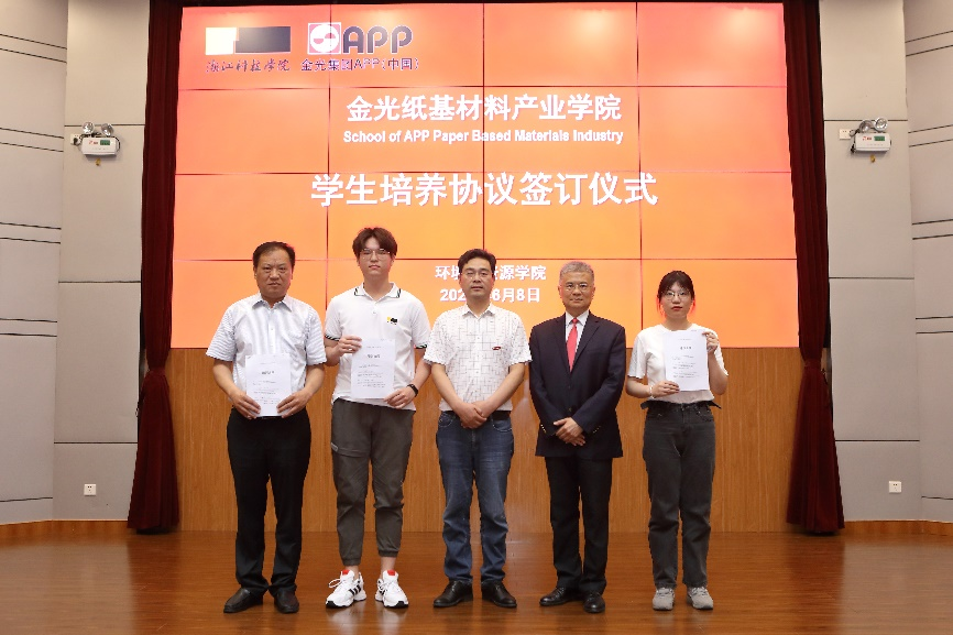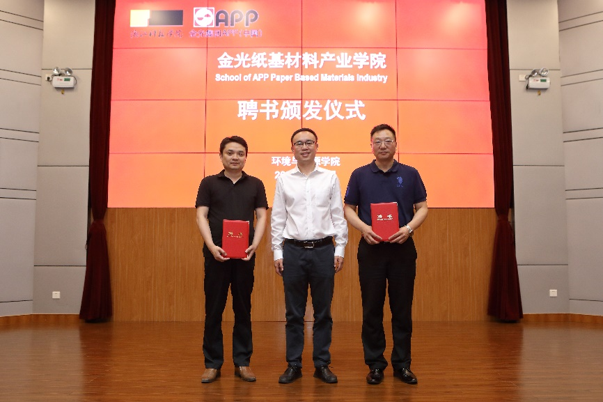 书记李俊为企业导师颁发兼职教师聘书。苗文峰经理现场与学生签订学生培养协议,与会领导为学生颁发金光纸基材料产业学院特色班学员证。