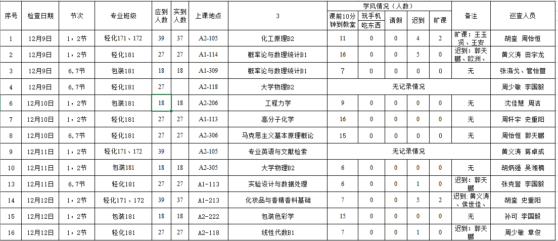 轻化181,实验设计与数据处理,翟睿老师,应到27人,13:20分到教室6人,13:25分到12人,13:30到26人,其中迟到1人(郭天鹏),教师备课充分,课堂氛围较好,部分同学积极性有待提高。