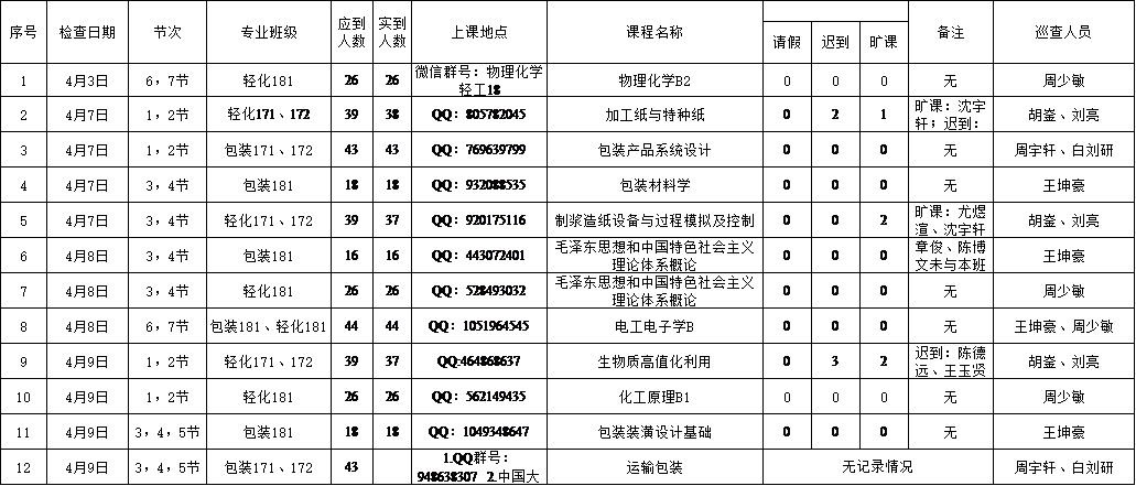 本周学风巡查中出现较多同学迟到以及旷课,其中有同学多次旷课以及迟到,希望学委能够及时询问原因并提醒。在下周的学风巡查中迟到和旷课的同学能够有所减少。