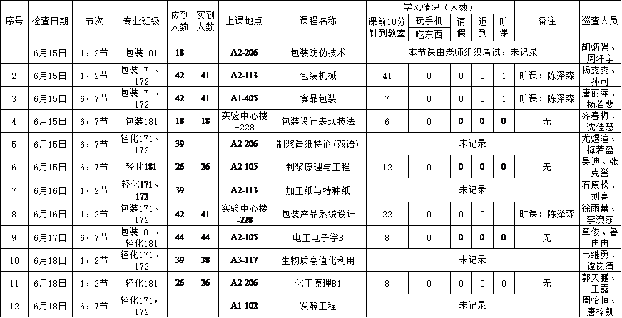 周二12节:包装171、172班,《包装产品系统设计》,陈玲江老师,应到42人,实到41人,陈泽森旷课;轻化171、172班,《加工纸与特种纸》,李静老师,考查课,期末考试,应到39人,实到39人;